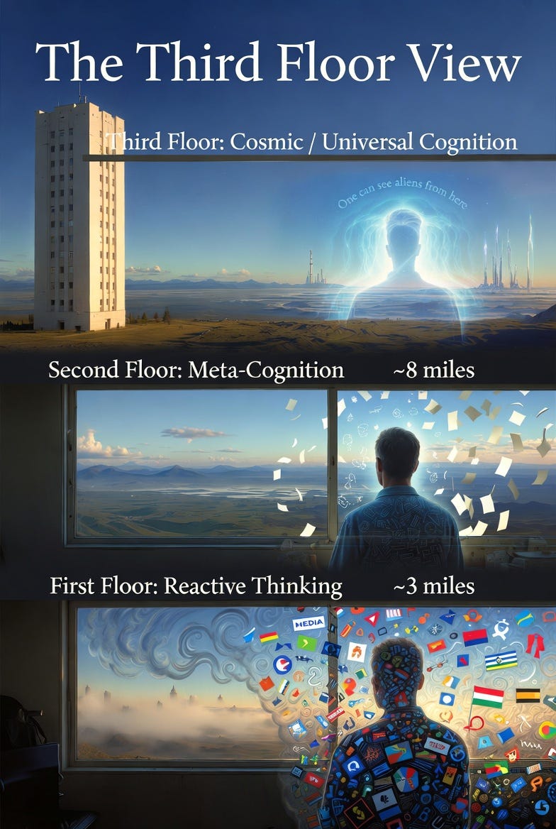 That process does not stop with the second floor. The meta-cog is always progressing. The nature of in real time self analysis of thoughts leads, sometimes, in some meta-cogs, to the Third Floor view.